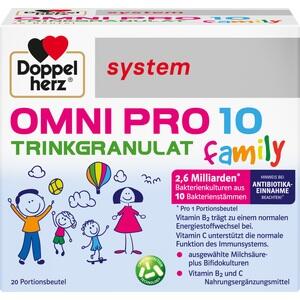 Doppelherz system Omni Pro 10 Trinkgranulat family enthält insgesamt 2,6 Milliarden Bakterienkulturen aus einer Kombination von 10 ausgesuchten Bakterienstämmen.